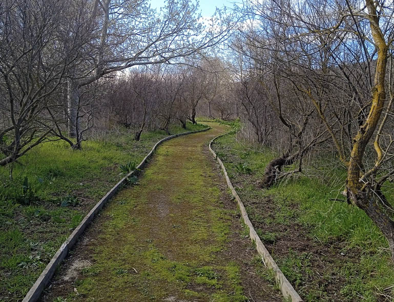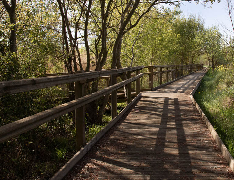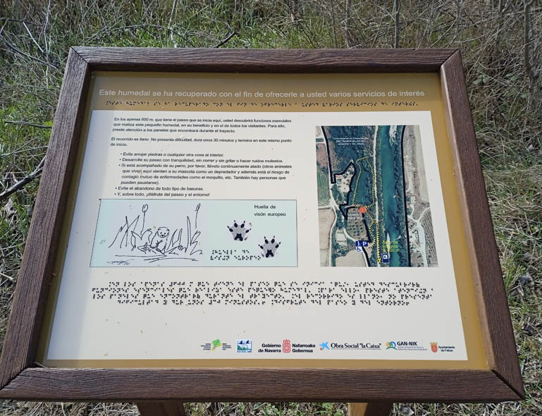 El sendero corto, de 500metros, está adaptado para personas de movilidad reducida y deficiencia visual. En este recorrido encontraremos diversos paneles de los beneficios que aporta este humedal, ofreciendo todos los ingredientes necesarios para favorecer la presencia de numerosas especies de animales y plantas, siendo su principal habitante el visón europeo.